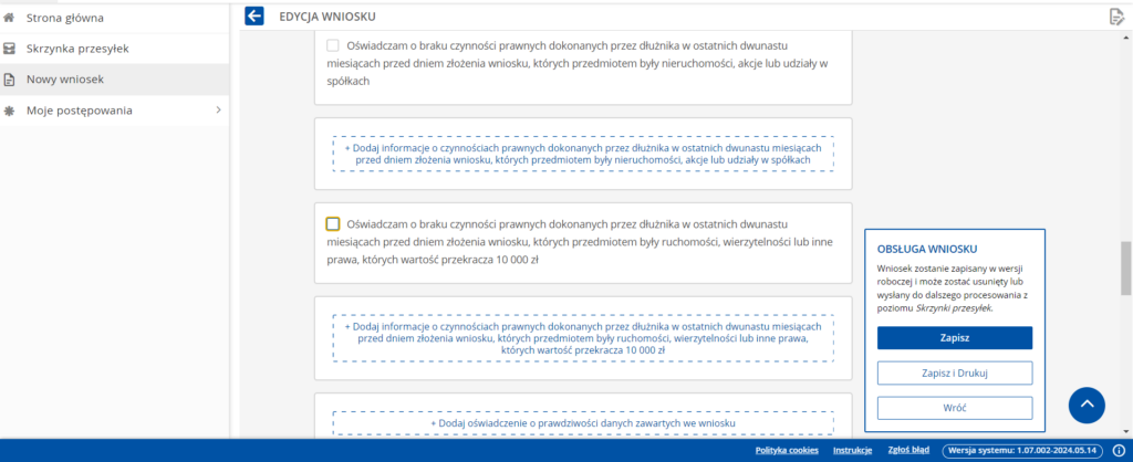 - Oświadczam o braku czynności prawnych dokonanych przez dłużnika w ostatnich dwunastu miesiącach przed dniem złożenia wniosku, których przedmiotem były ruchomości, wierzytelności lub inne prawa, których wartość przekracza 10 000 zł