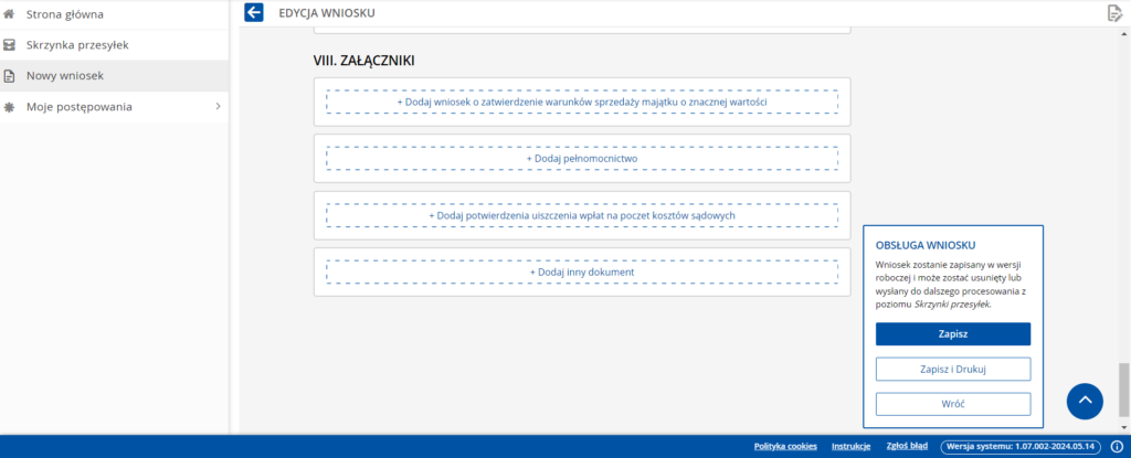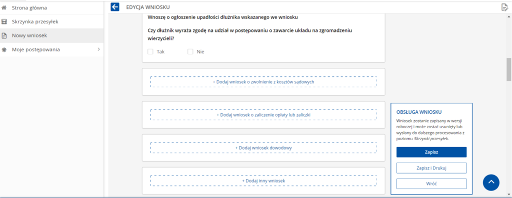 - Dodaj wniosek dowodowy – w tym miejscu można dodać dokumenty wskazujące na nasze zadłużenie (inną metodą jest ich dodanie na końcu wniosku jako załącznik)