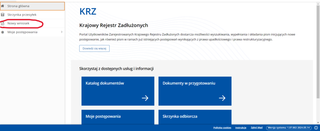 Posiadając już konto w systemie KRZ, aby złożyć wniosek o ogłoszenie upadłości konsumenckiej, należy się na nie zalogować. Następnie wybrać nowy wniosek i postępować z poniższą instrukcją: