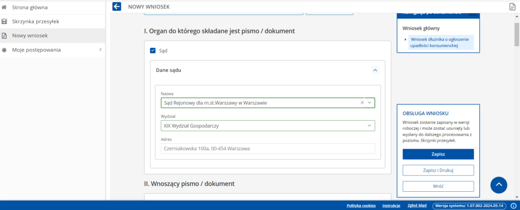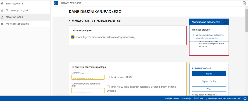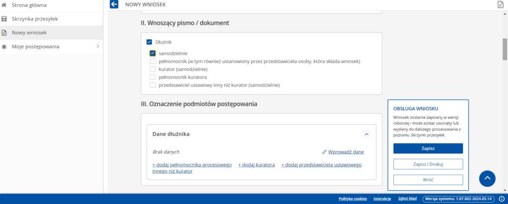 Nowy wniosek –> wyszukaj wzór pisma –> wpisać 20177.5 (Wniosek dłużnika o ogłoszenie upadłości konsumenckiej)