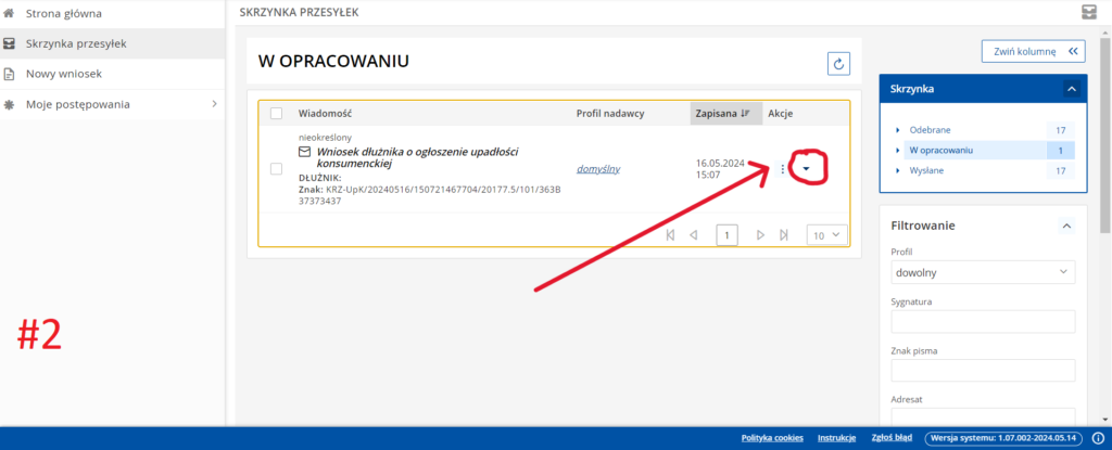2. W skrzynce przesyłek „w opracowaniu” znajduje się nasz wniosek – rozwijamy zakładkę za pomocą trójkąta zwróconego w dół